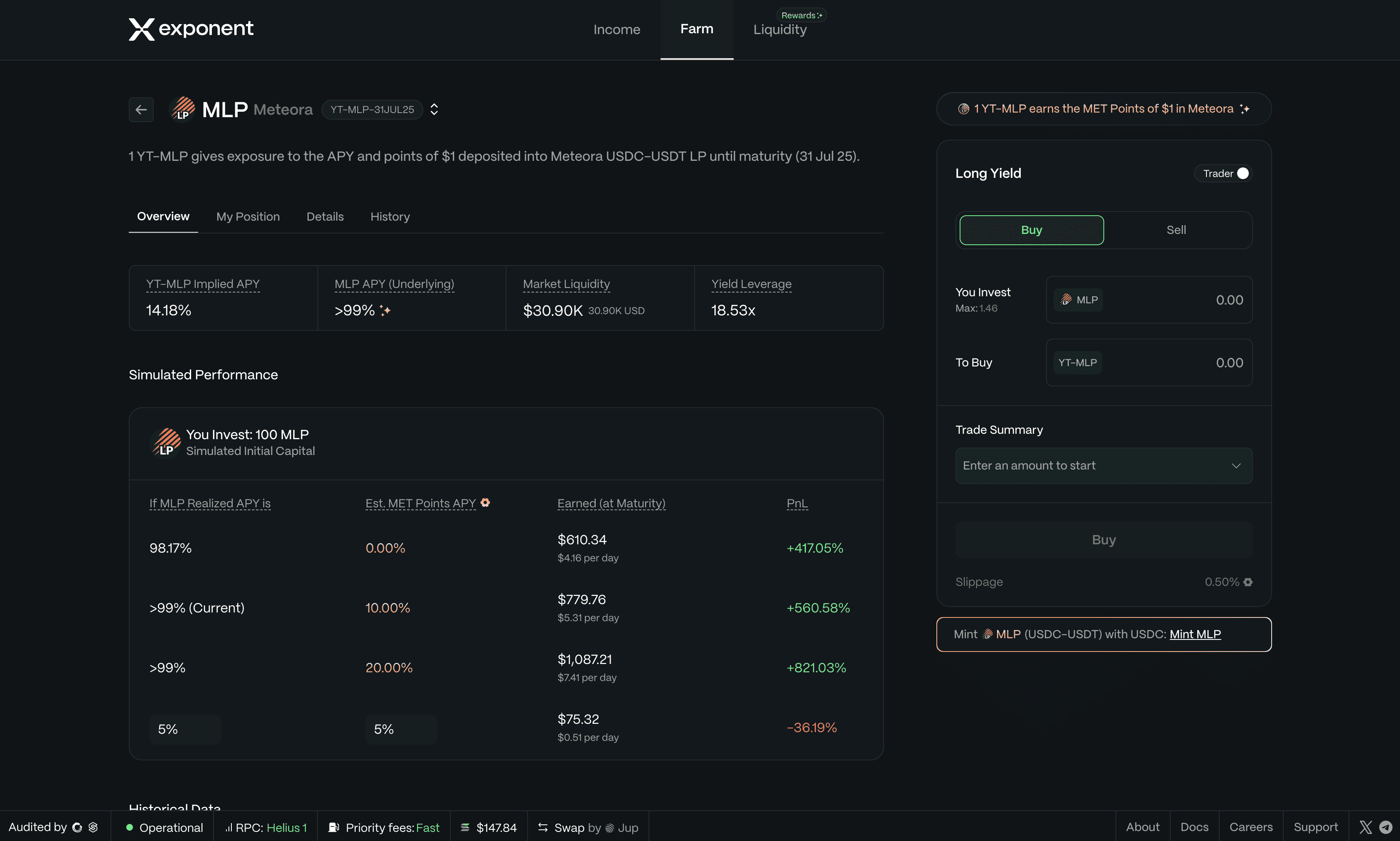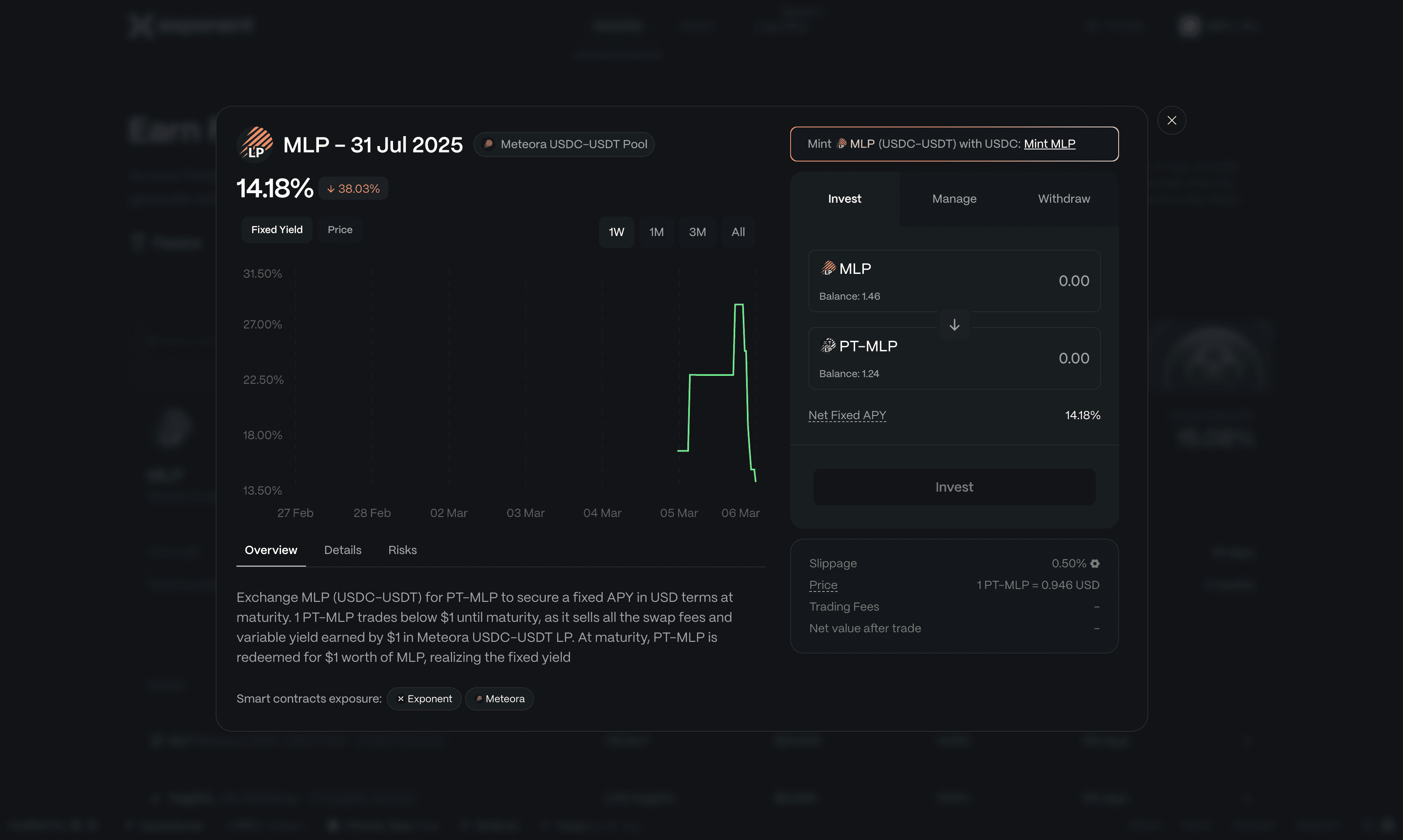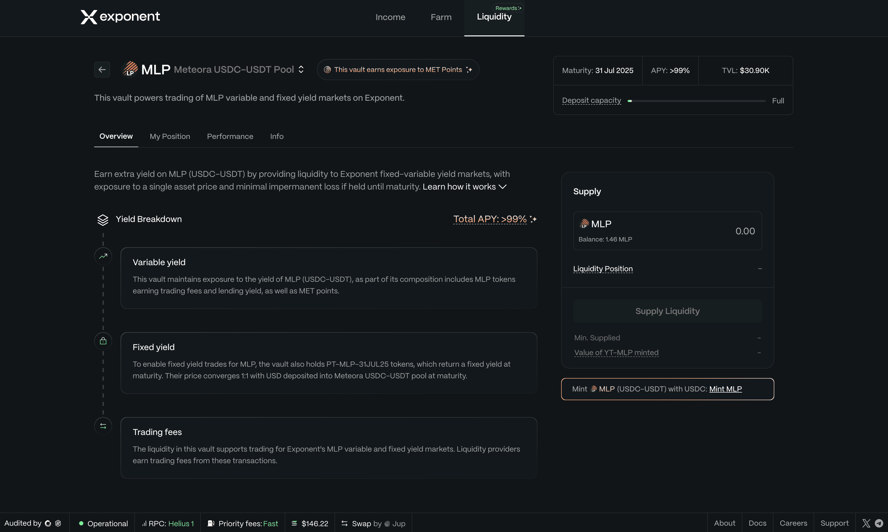 Supply MLP (USDC-USDT) into the Exponent yield market and earn dual exposure to variable & fixed yields with minimal IL.
